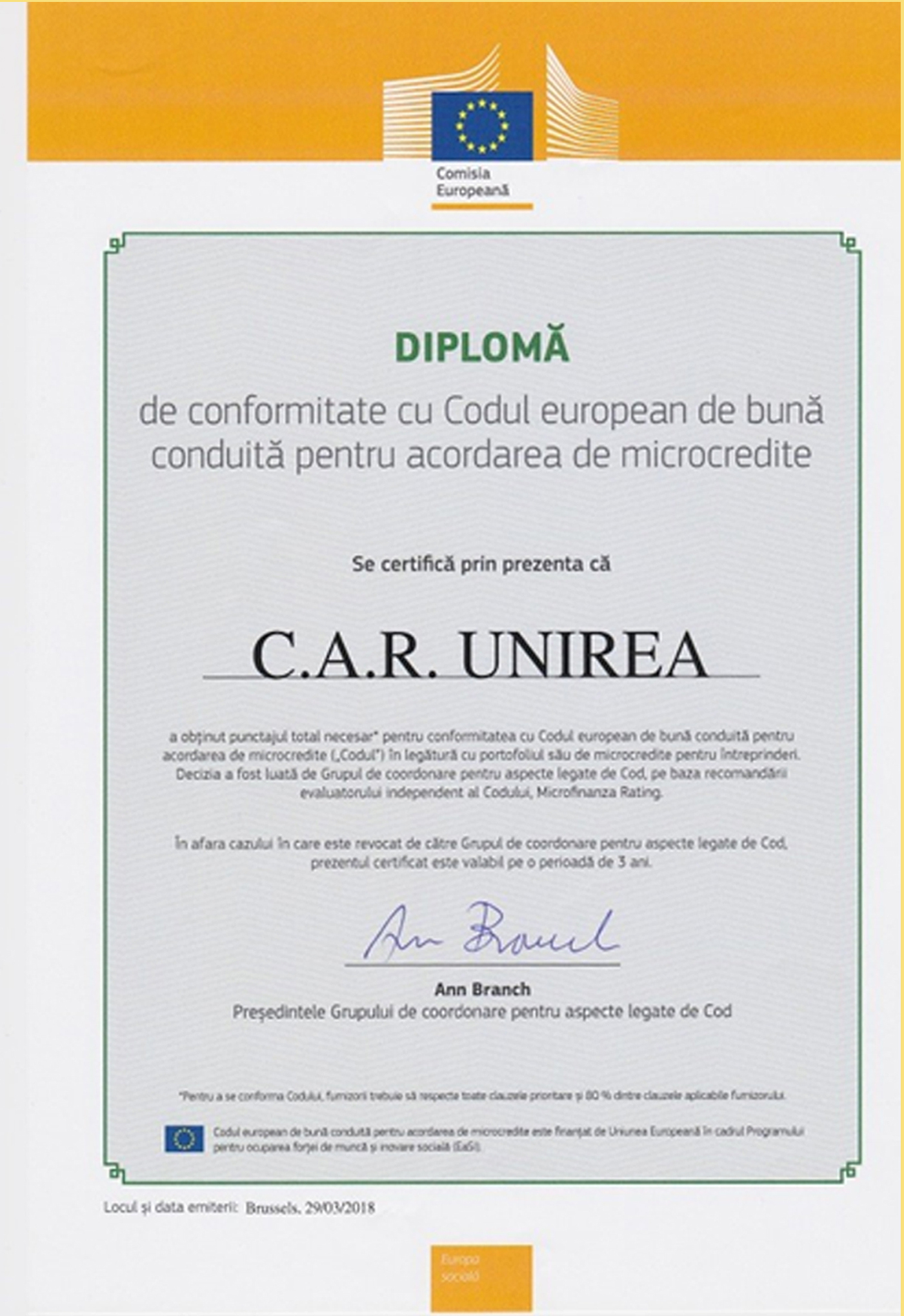Din 15 martie 2018 C.A.R. Transilvania este detinatoarea Certificatului European de Bune Practici in Microfinantare, atribuit de catre Comisia Europeana DG Employment si Social Affairs and Inclusion.